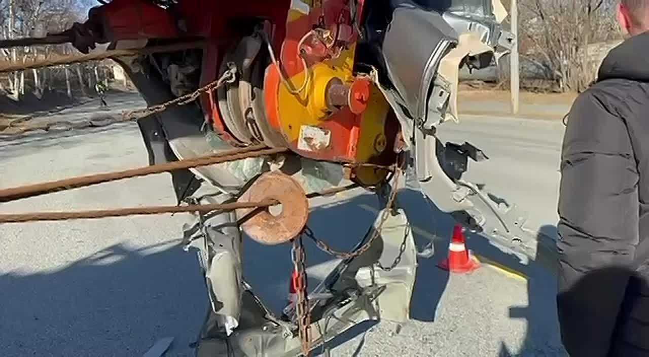 От удара поврежденное транспортное средство откинуло на световую опору.