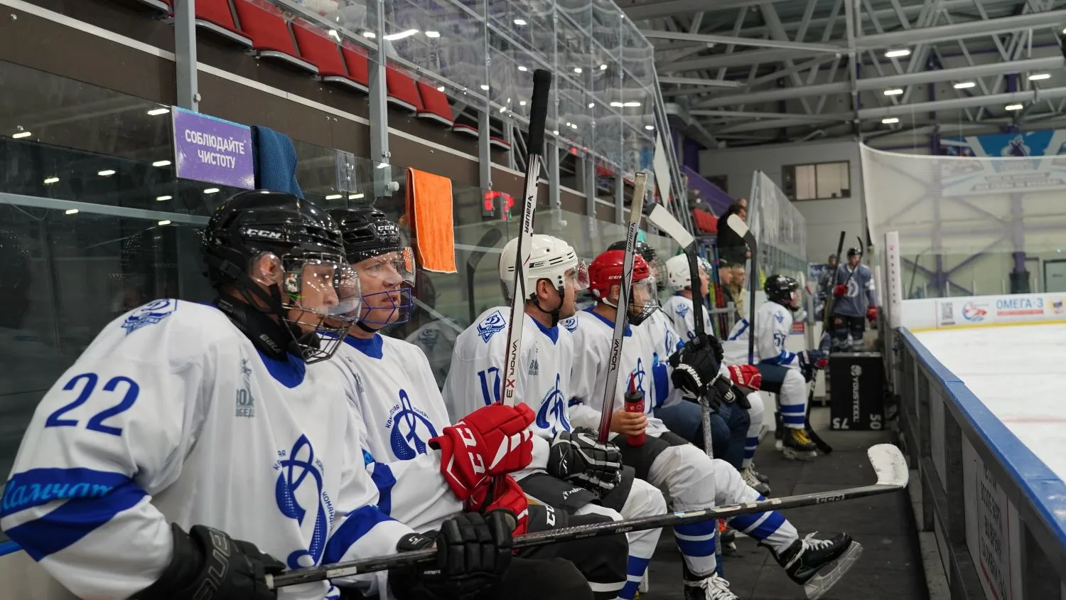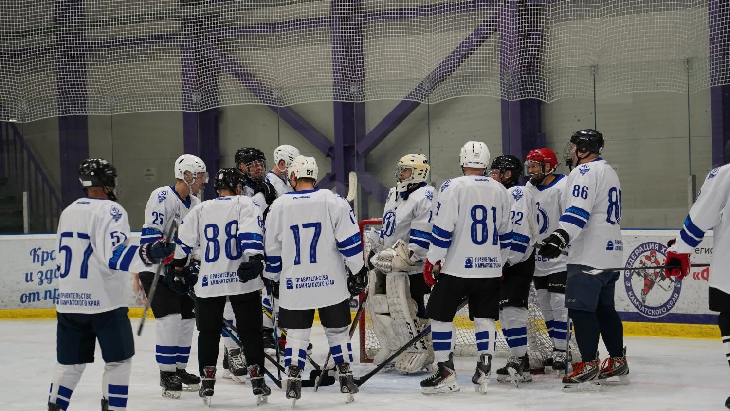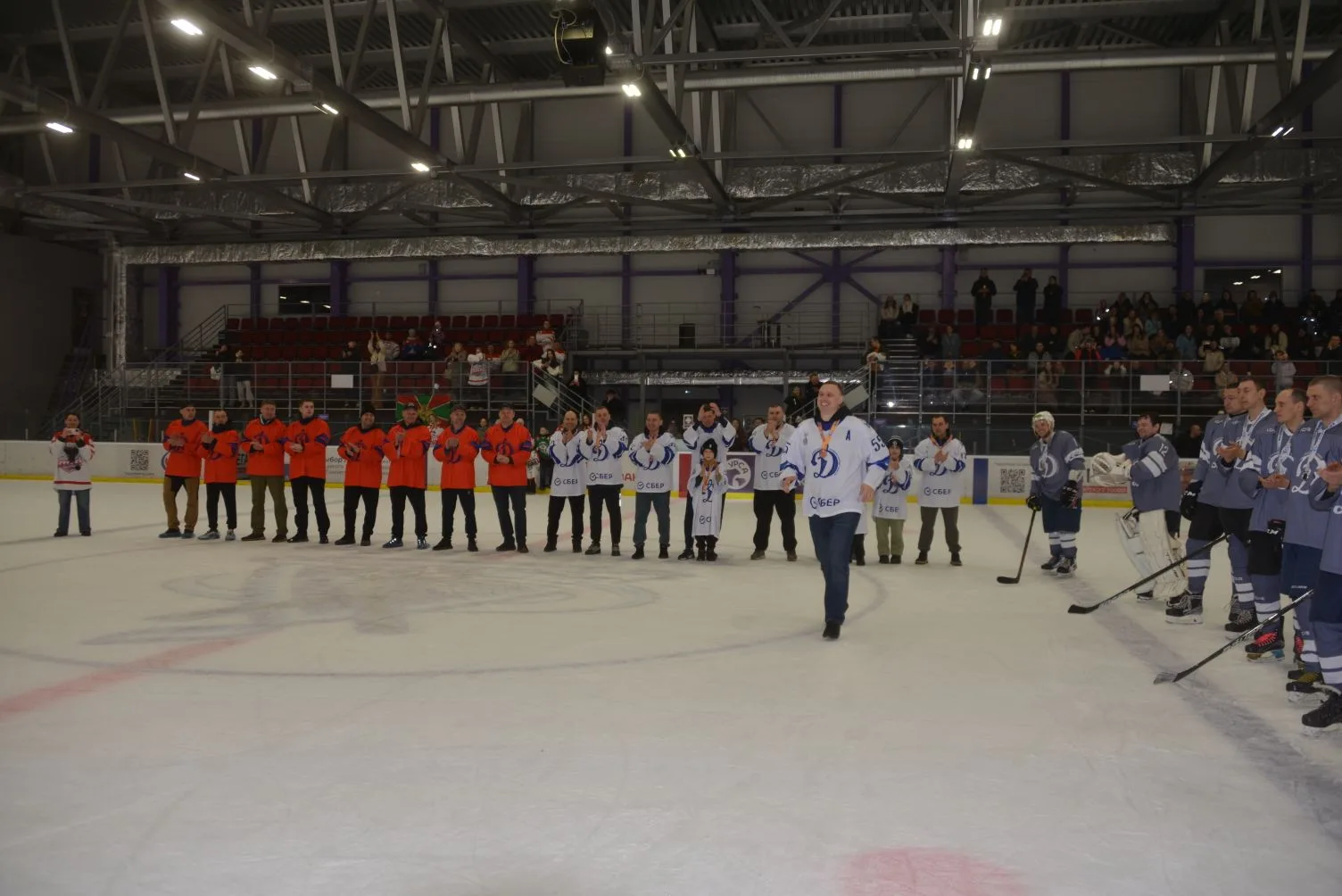 На лёд арены «Вулкан» вышли сборные команды физкультурных коллективов из действующих сотрудников, ветеранов силовых ведомств и органов правопорядка