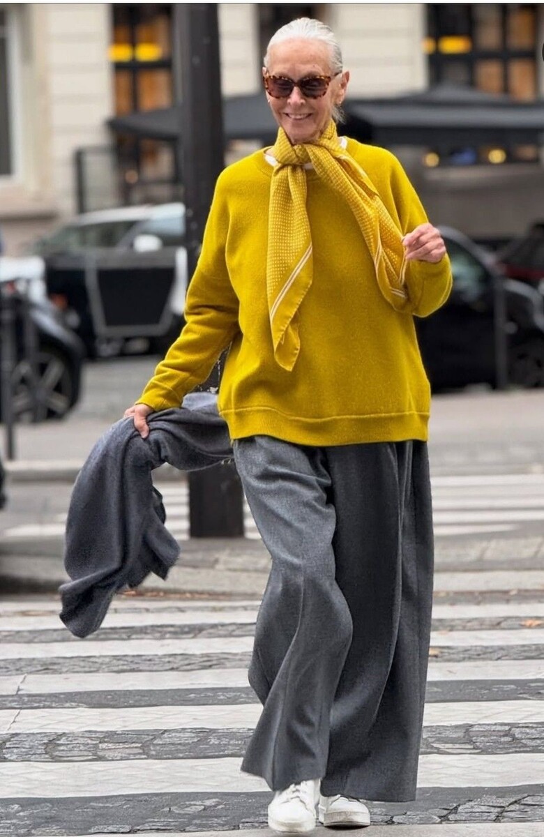 - Для создания оригинального и притягивающего образа подойдут широкие серые брюки из плотного материала вместе с кашемировым свитером в горчичном оттенке. Дополнить комплект можно горчичным шейным платком и белыми кроссовками.