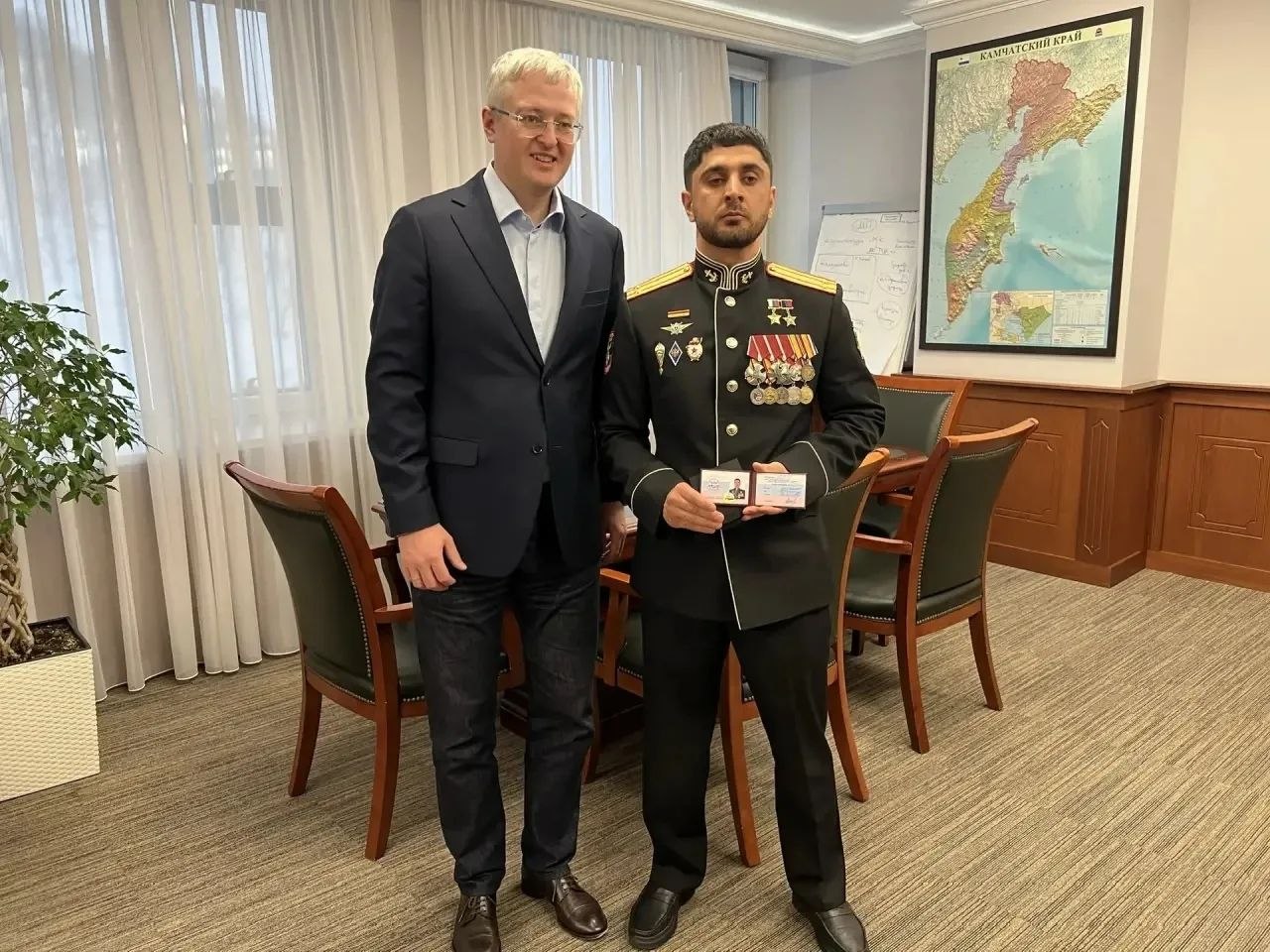 Владимир Солодов вручил Герою России Хантемиру Султанову удостоверение члена камчатской Ассоциации ветеранов СВО