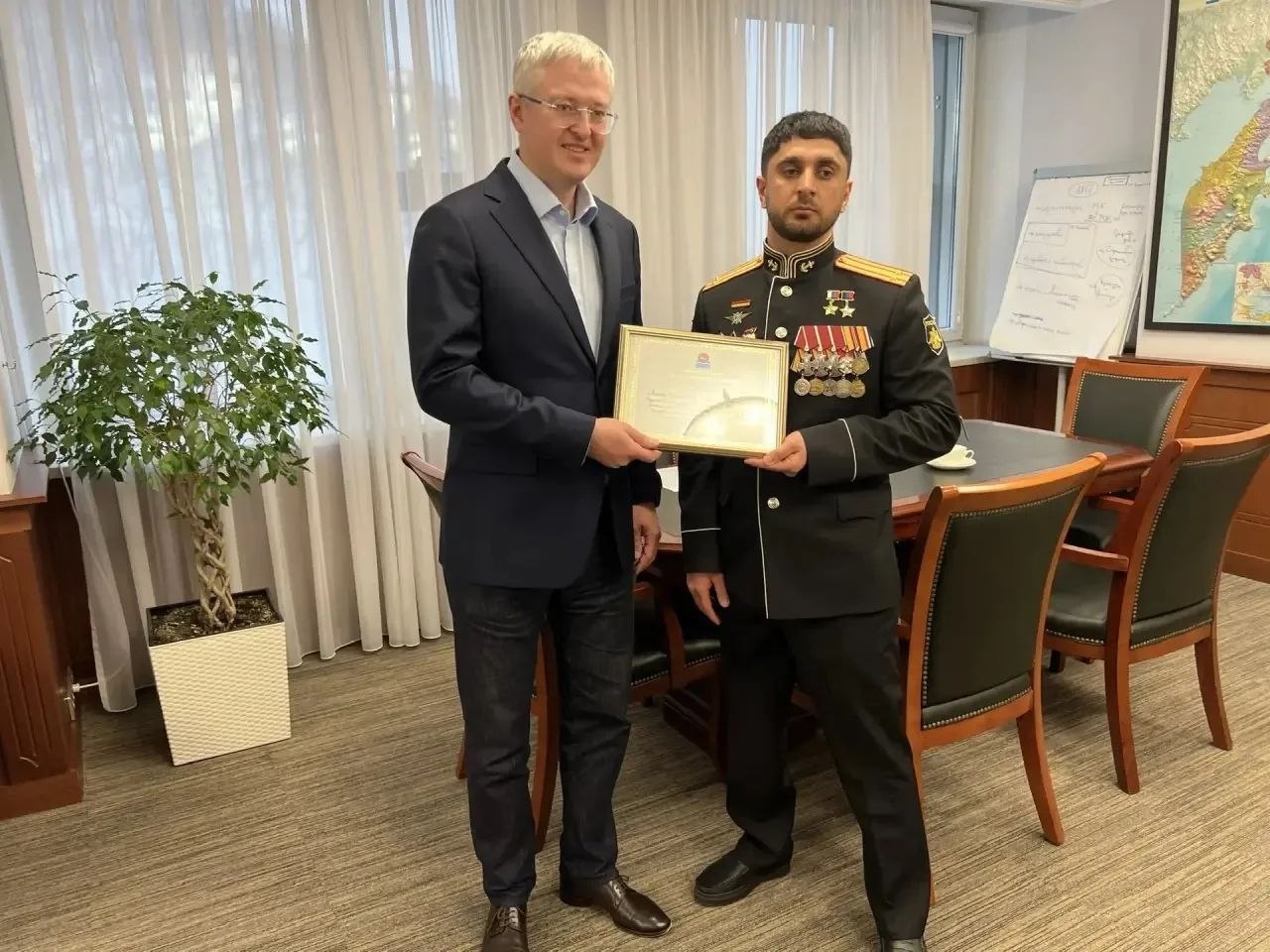 Губернатор Камчатского края Владимир Солодов провел встречу с командиром штурмового отряда 40-й бригады морской пехоты, Героем России Хантемиром Султановым.