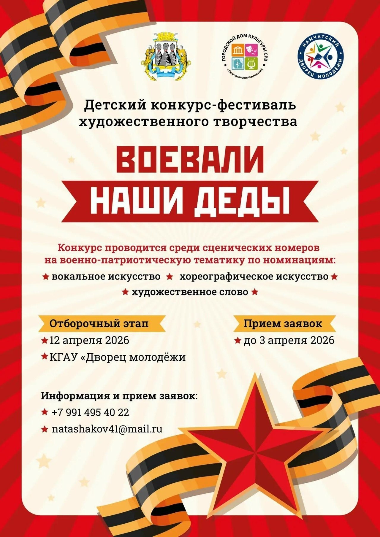 Конкурс открыт для юных талантов ПетропавловскаКамчатского, готовых продемонстрировать своё мастерство в сценических номинациях: вокальном искусстве, хореографическом искусстве и художественном слове.