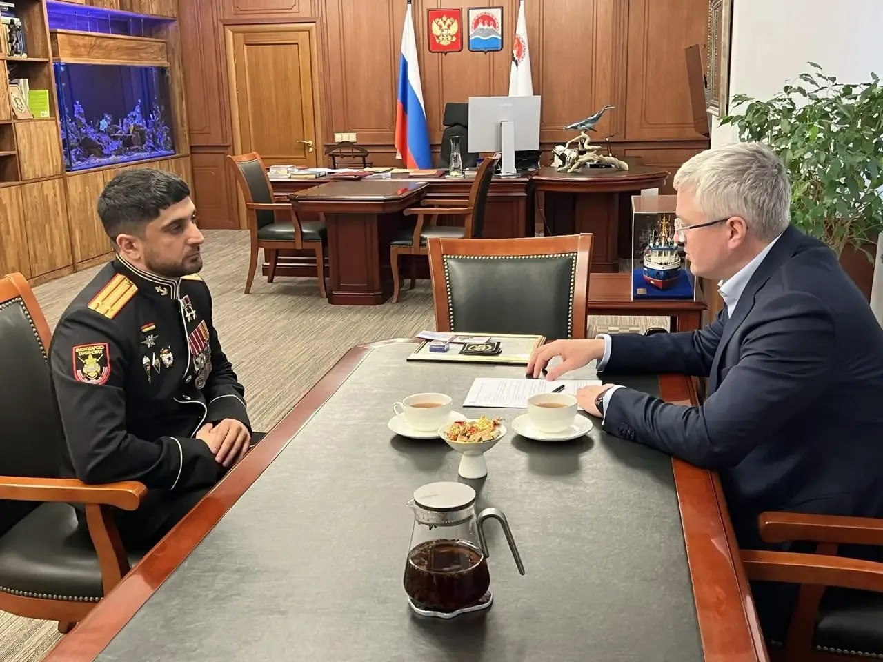 Губернатор Камчатки Владимир Солодов встретился с командиром штурмового отряда 40-й бригады морпехов Хантемиром Султановым. Глава региона лично вручил офицеру удостоверение участника краевой «Ассоциации ветеранов СВО» и передал благодарственное письмо его родителям.