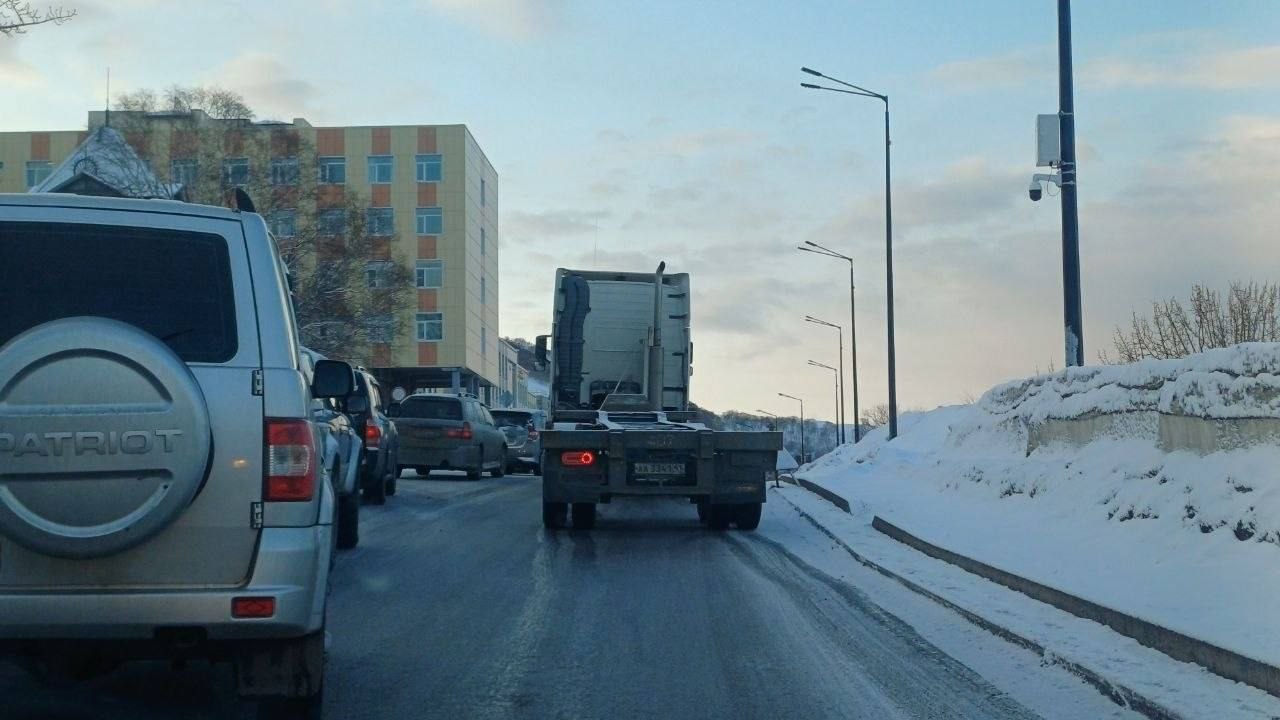 На Ленинской в сторону ДОФа фура не смогла подняться в гору — лёд не пускает.