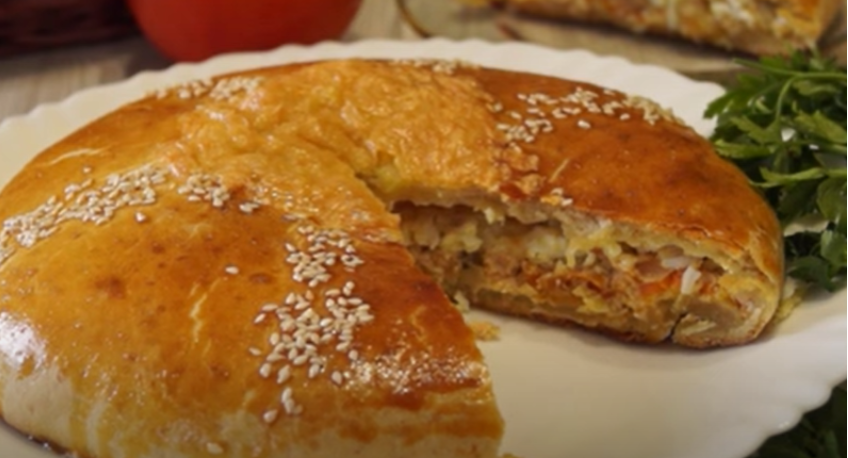 После предварительной подготовки начинку дополняют натертыми яйцом и сыром, создавая насыщенный вкус. Разделив тесто на две части, одной частью выстилается форма для выпекания, затем укладывается начинка, и пирог закрывается второй частью теста. Края подгибаются для красивой формы. Пирог перед выпечкой смазывается желтком и посыпается кунжутом.