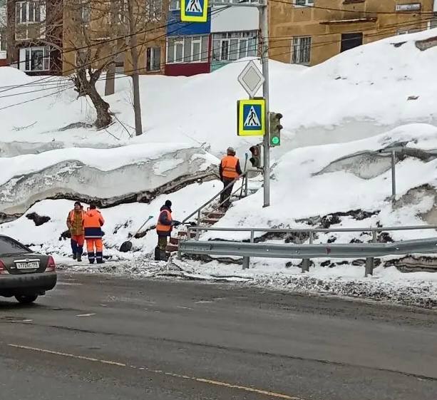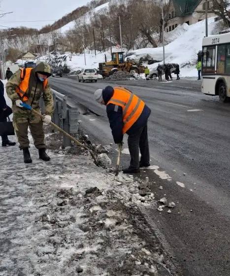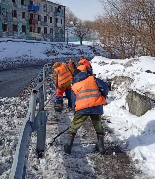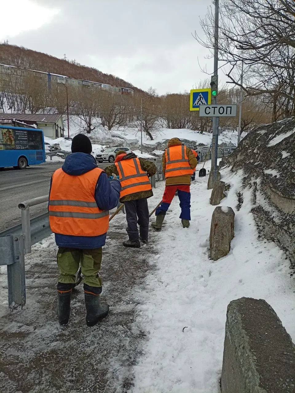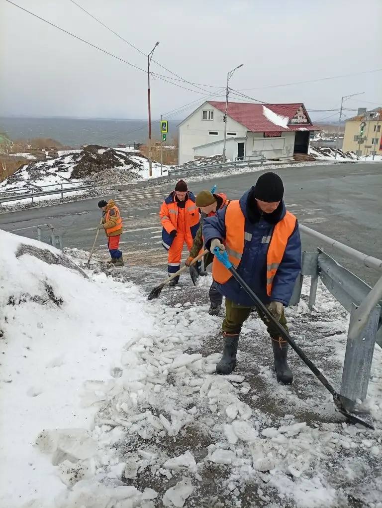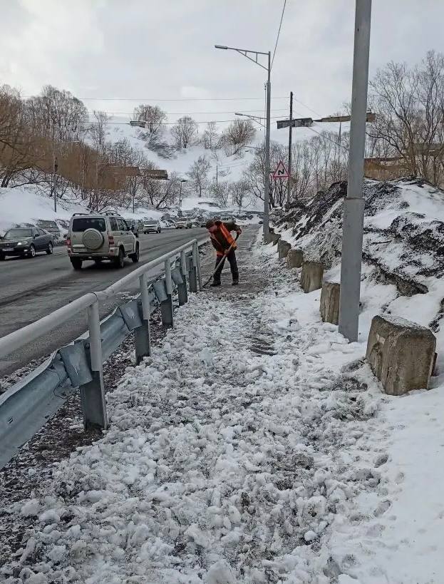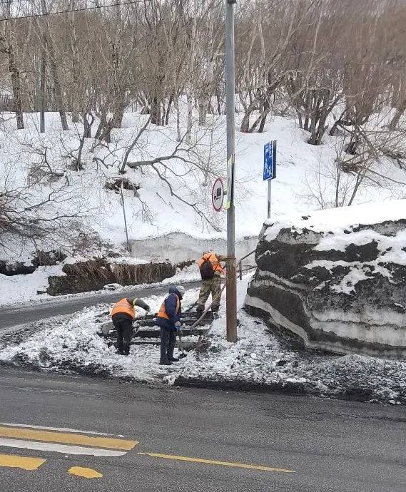 Бригады ручного труда продолжают работы по расчистке пешеходных зон.
