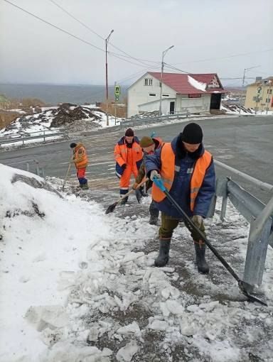 Бригады ручного труда расчищали тротуары, автобусные остановки и прилегающие к ним территории от мусора и снега по ул. Пограничная, ул. Солнечная, ул. Степная, ул. Арсеньева, ул. Даурская, ул. Ленинградская, ул. Озерновская коса, ул. Океанская.