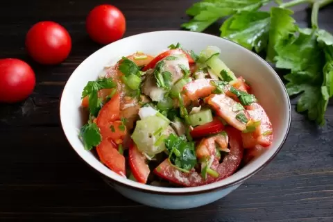 Ищете быстрый и вкусный рецепт для ужина? Приготовьте салат с вареной курицей, помидорами и хрустящими стеблями сельдерея! Этот освежающий и яркий салат не только порадует глаз, но и подарит отменный вкус.