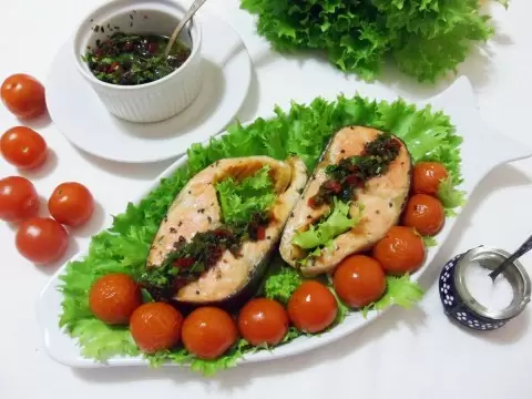 На праздничном столе в день Благовещения рыба заслуженно занимает центральное место, и запеченный лосось с острой сальсой из зеленого лука — это не только вкусно, но и эффектно! Это блюдо можно смело назвать изюминкой стола, ведь оно сочетает в себе нежное мясо рыбы и пикантные ноты яркой сальсы, которая придаст оригинальность любому застолью.