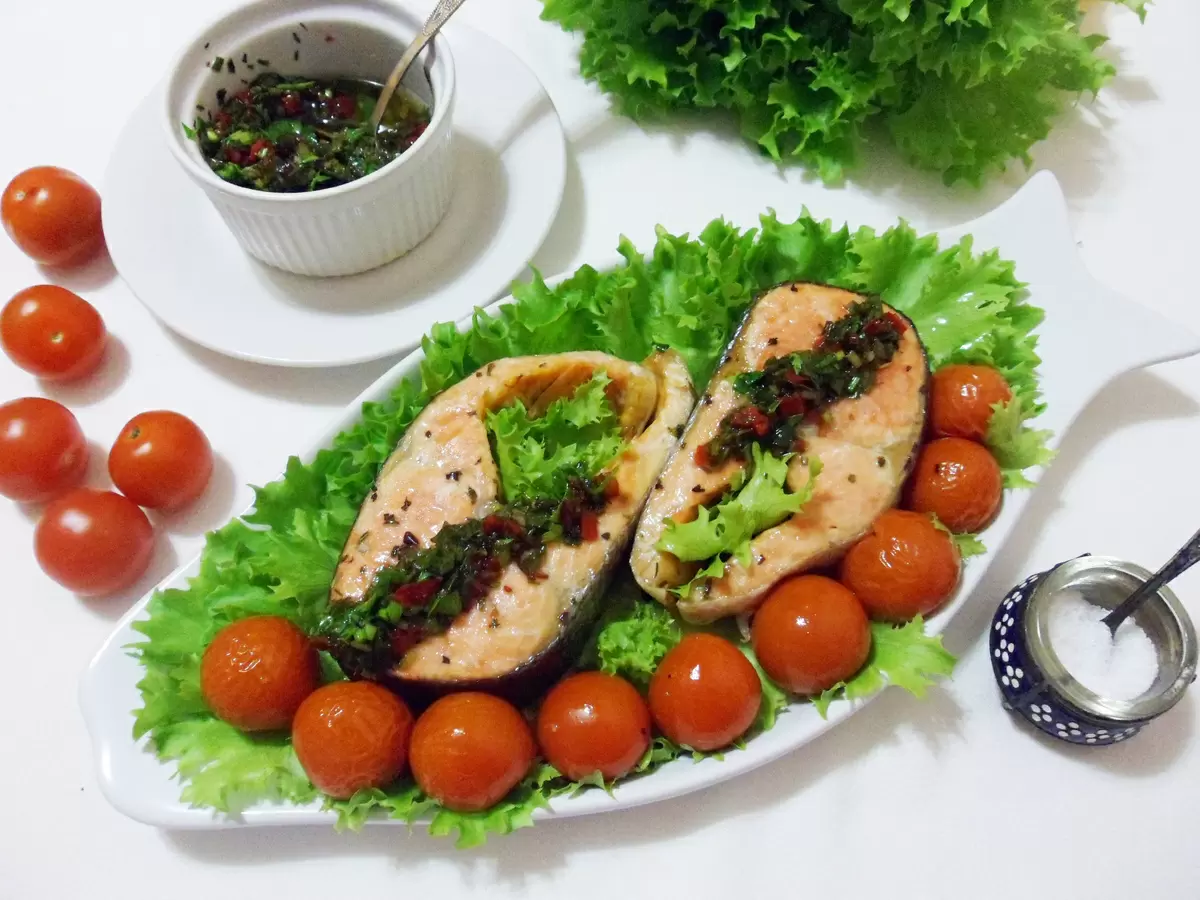 Когда запеченные стейки лосося будут готовы, их необходимо переложить на сервировочное блюдо, украсить листьями зеленого салата и добавить запеченные помидоры. На каждый стейк кладется чайная ложка сальсы, что придаст блюду особую пикантность. Легкость и свежесть этого угощения станут отличным дополнением к праздничному столу!