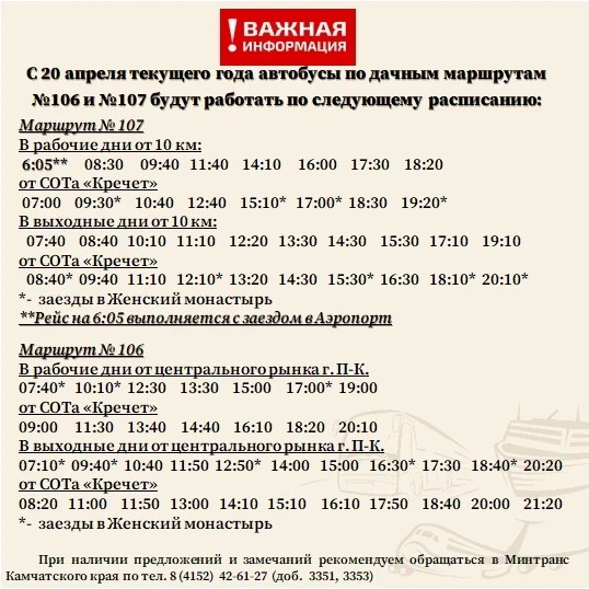 По всем вопросам, предложениям и замечаниям пассажиры могут обращаться в Минтранс Камчатского края по телефону: 8 (4152) 42-61-27 (добавочные 3351, 3353).