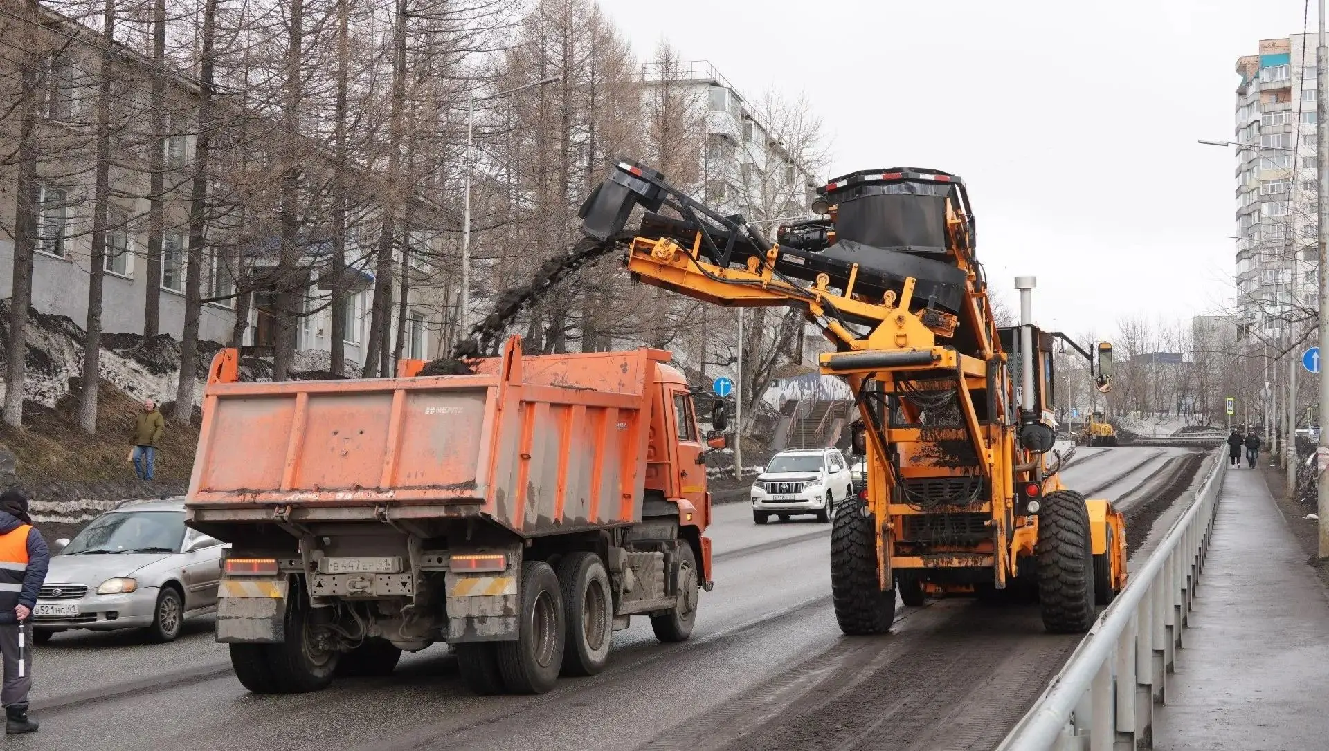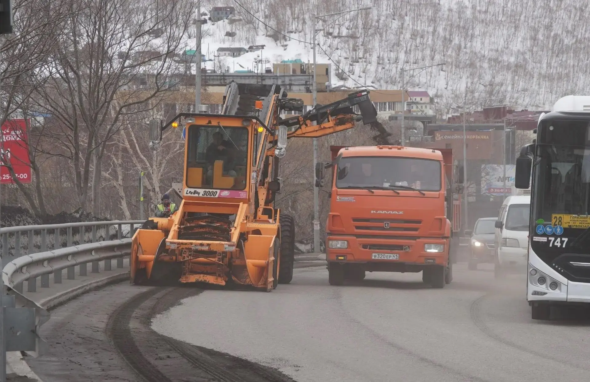 В Петропавловске-Камчатском МУП «Спецдорремстрой» продолжает работы по уборке песка с городских территорий. Для уборки песка с дорог краевого центра предприятие подключило к работе погрузчик «LeeBoy 3000».