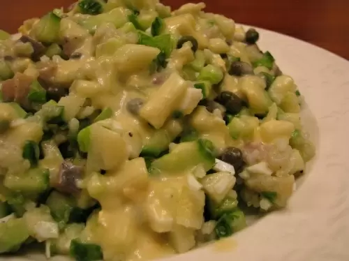 Соус для салата готовится путем тщательного размешивания отложенного желтка с горчицей до однородной консистенции. Важно избегать комков, добавляя растительное масло и лимонный сок медленно, порциями. Будьте осторожны с добавлением соли, так как селедка и каперсы могут сделать блюдо достаточно соленым.