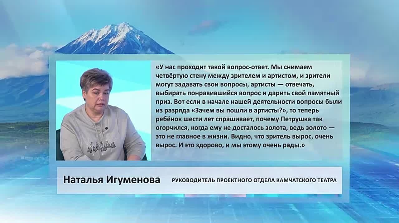 Вот если в начале нашей деятельности вопросы были из разряда «Зачем вы пошли в артисты?», то теперь ребёнок шести лет спрашивает, почему Петрушка так огорчился, когда ему не досталось золота, ведь золото — это не главное в жизни. Видно, что зритель вырос, очень вырос. И это здорово, и мы этому очень рады.», — Наталья Игуменова, руководитель проектного отдела камчатского театра.