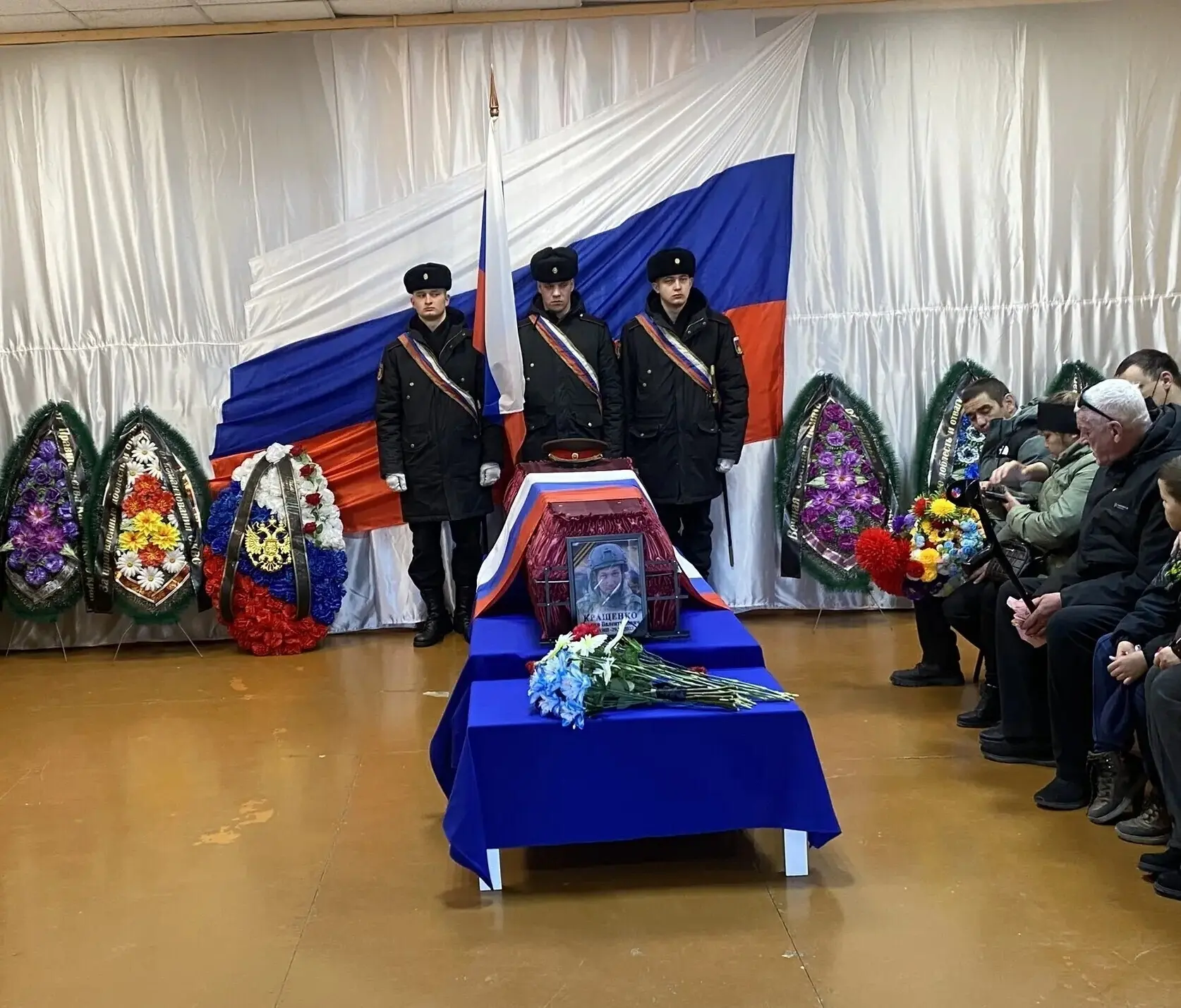 Траурная церемония прошла в помещении культурно-досугового центра «Родник». Возле гроба с телом павшего бойца замер почётный караул из военнослужащих, а при входе и у государственных флагов несли вахту юнармейцы.