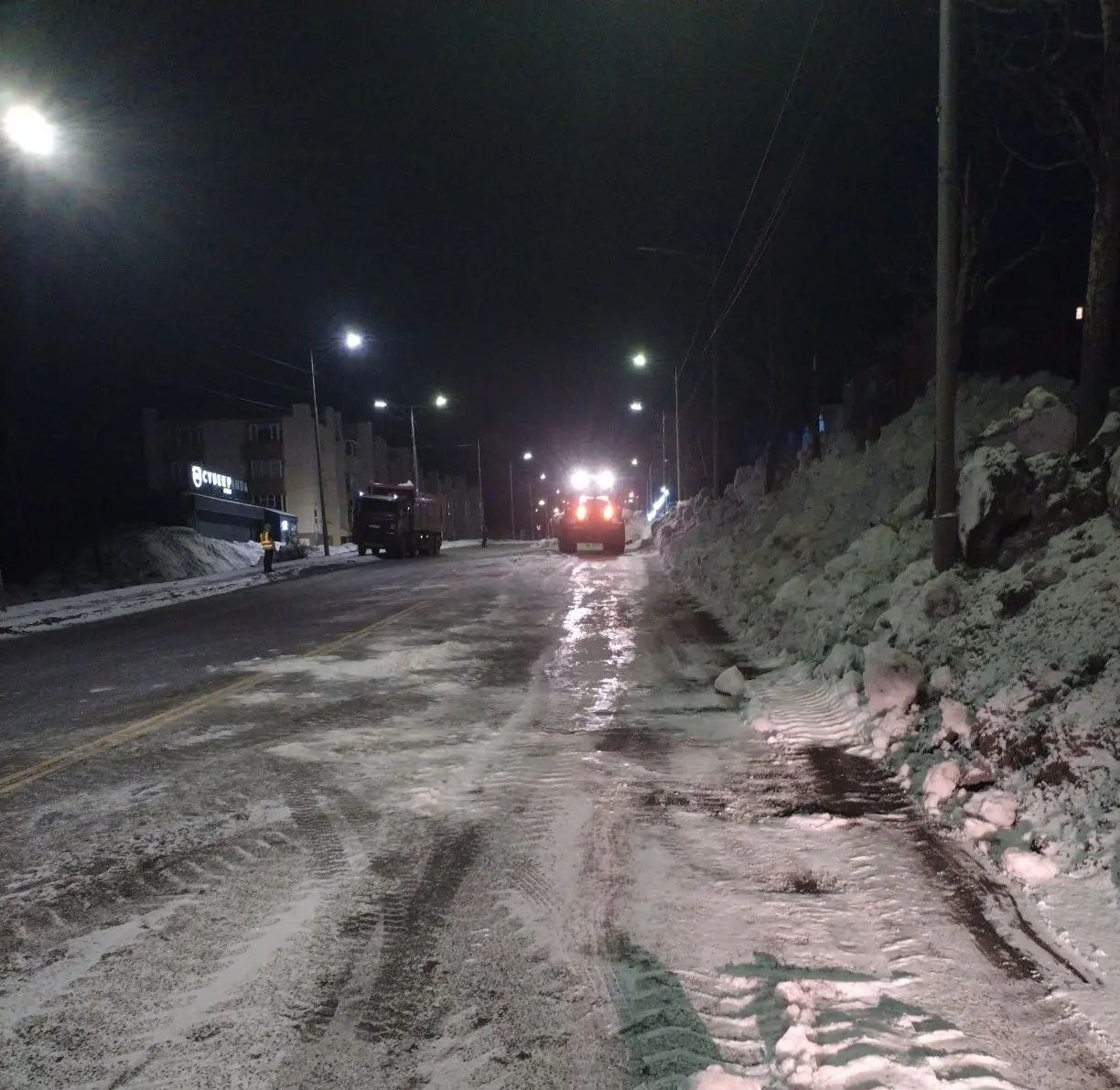 В ночную смену продолжается вывоз снега и посыпка дорог противогололедными материалами.