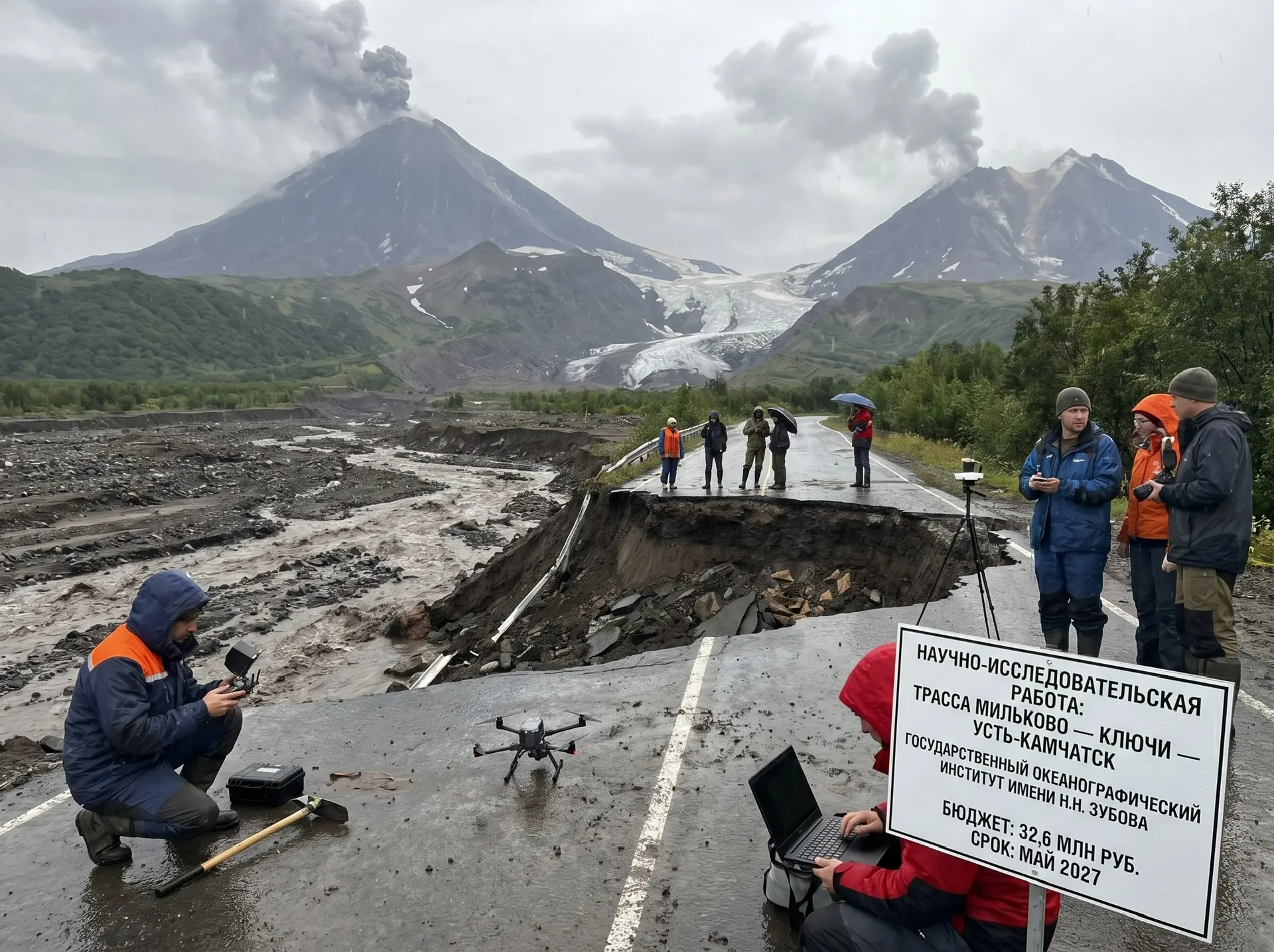 Ученым предстоит изучить сложную цепочку: как пепел от вулканов заставляет таять ледники и превращать их в мощные селевые потоки, которые сносят дорожное полотно.
