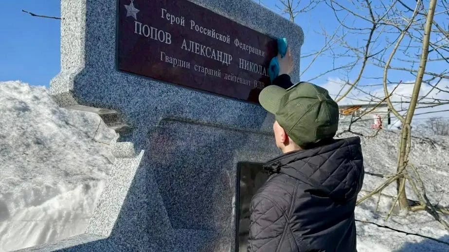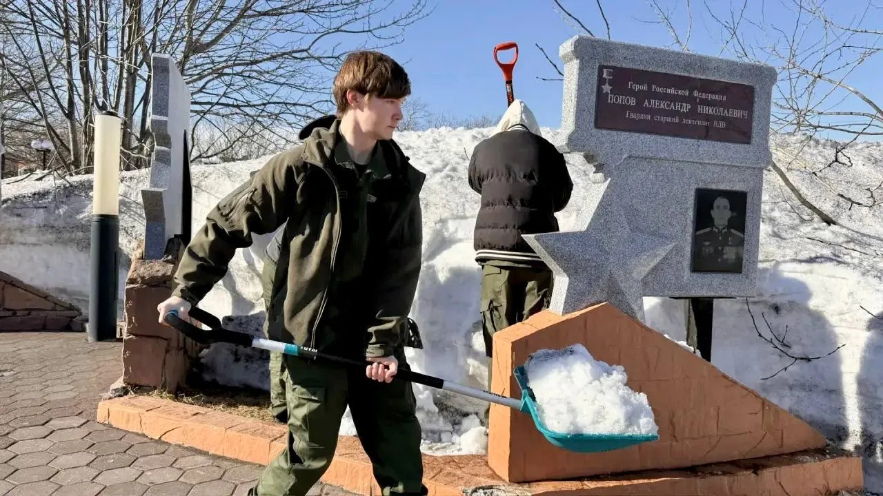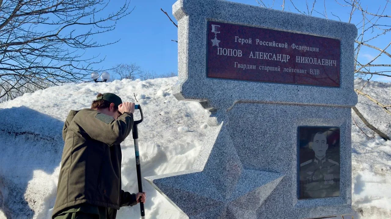 Курсанты камчатского филиала Центра «ВОИН» навели порядок у памятника Герою России, участнику специальной военной операции Александру Попову. Памятник был установлен на аллее Героев в Парке Победы в Петропавловске-Камчатском в 2023 году. Ребята очистили памятный знак и территорию вокруг от снега.