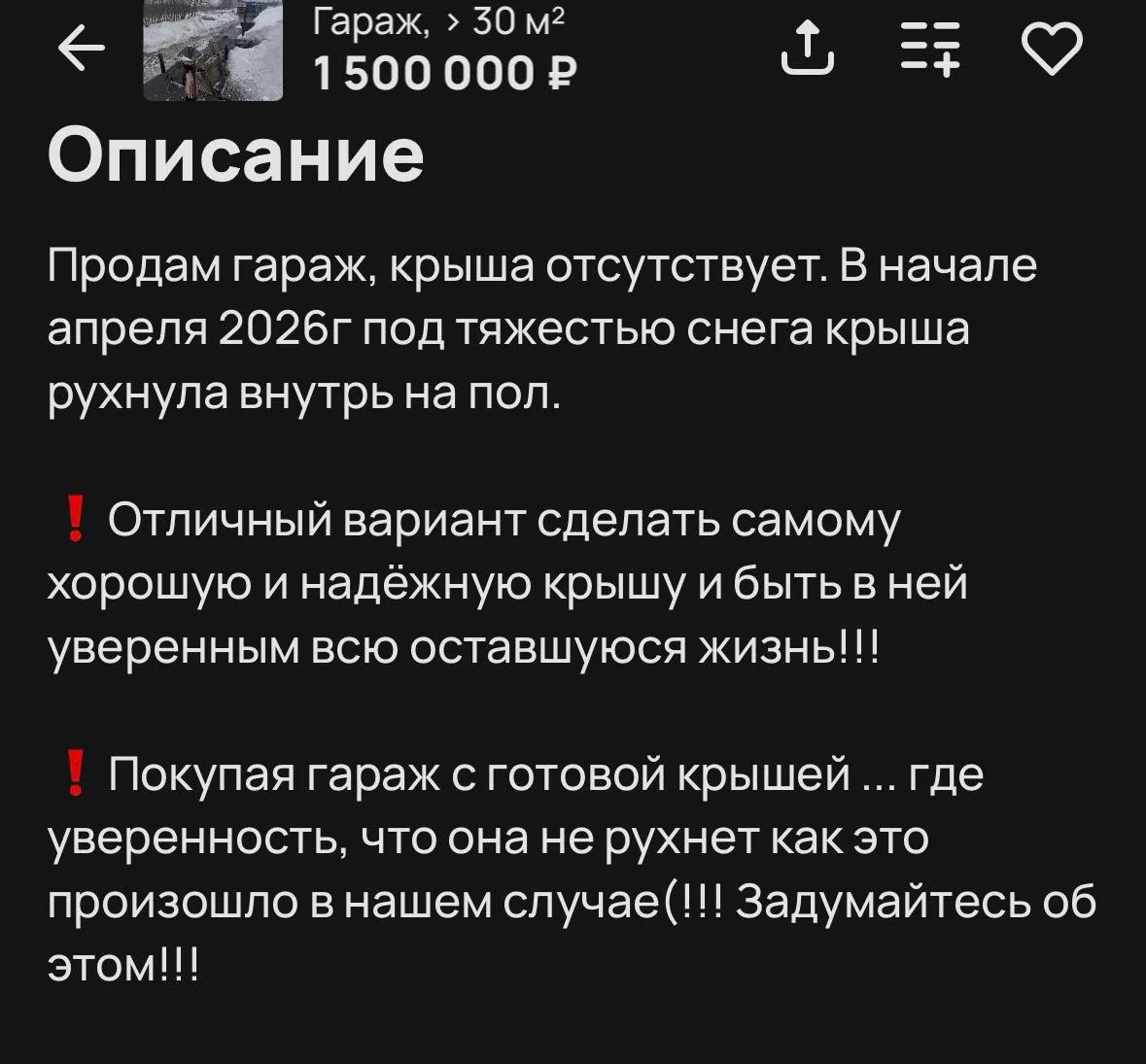 На Камчатке продают гараж, который стоит 1,5 миллиона рублей. Но у него есть одна особенность — крыша обрушилась.