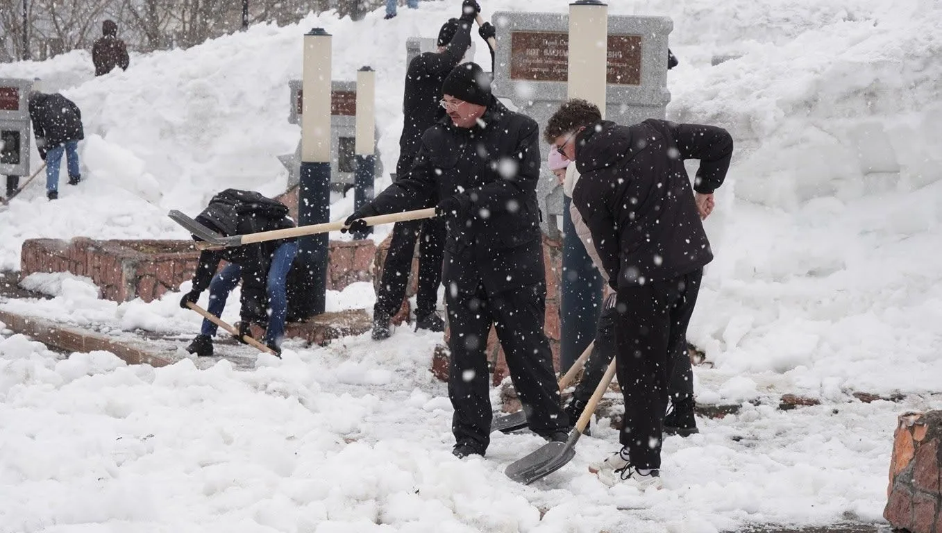 Анатолий Кирносенко, ветеран СВО Евгений Мищенко, члены «Молодой Гвардии Единой России», активисты партии и Молодёжного парламента объединились в рамках Всероссийского субботника «Единой России», чтобы убрать снег и мусор на территории сквера, а также очистить памятник.