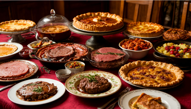 - Стол — щедрый, но умеренный. Готовят мясные блюда, пироги и кисель, украшают дом теплыми нотами кухни. В центре — поросёнок или свиная голова как символ будущего процветания, который раздают по кускам гостям.