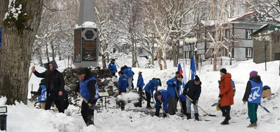 В сквере Свободы участники очистили территорию от снега и мусора, восстановили порядок у памятника воинам-освободителям Курильских островов.