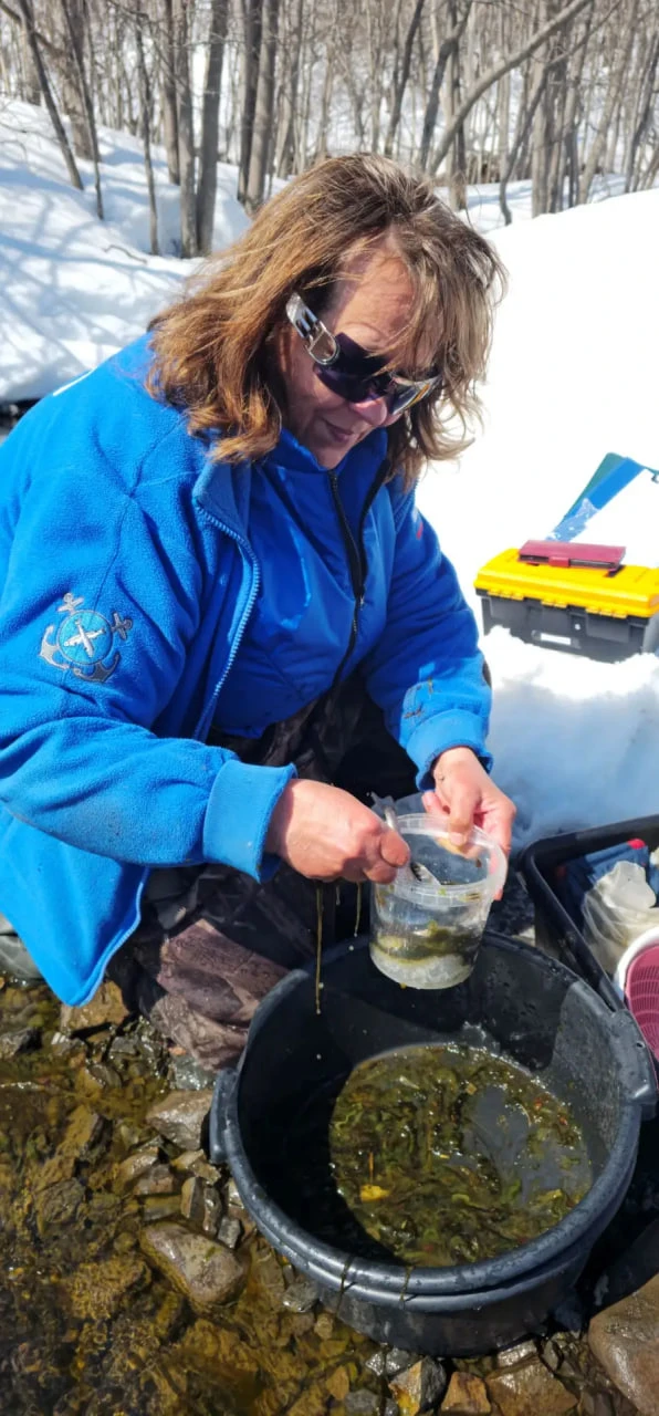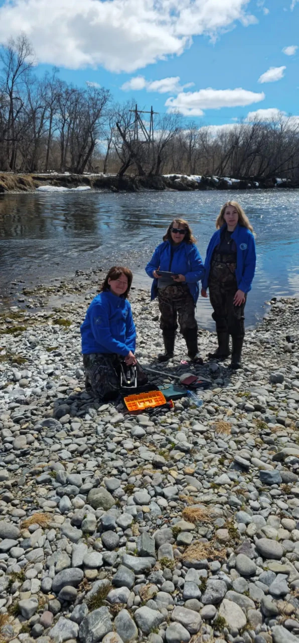 Сотрудники лаборатории Кристина Лукина, Татьяна Травина, Надежда Растягаева провели мониторинг условий нагула молоди тихоокеанских лососей. Они оценили кормовую обеспеченность молоди рыб, измерили глубину реки, скорость течения и температуру воды и воздуха, взяли количественные проб бентоса со дна водоема. В местах сбора проб ученые провели облов молоди лососей мальковым неводом.