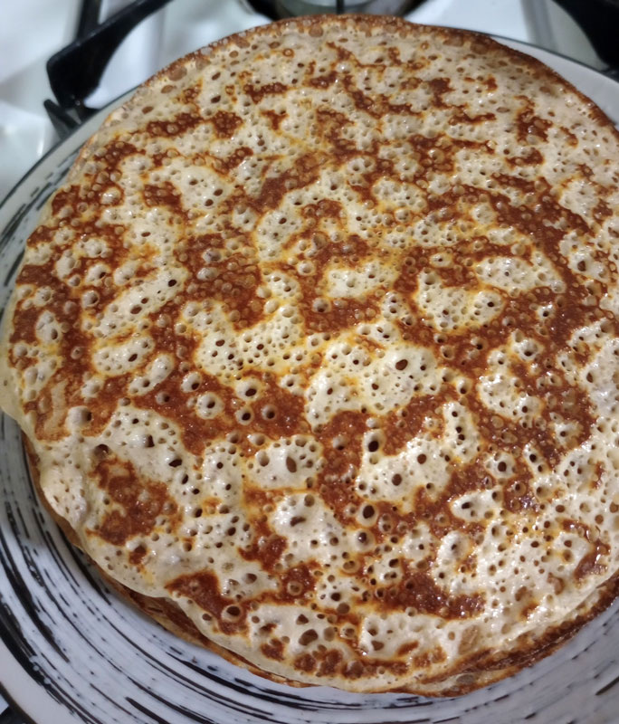 Выпекайте на хорошо разогретой сковороде с антипригарным покрытием без дополнительного масла. Будьте осторожны при перевороте блинов, так как они могут быть более хрупкими, чем пшеничные. Обратите внимание, что дырочки образуются только с одной стороны, что не влияет на вкус.