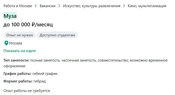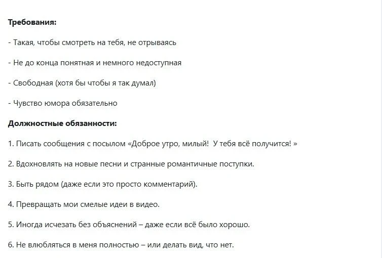 Вакансию на российском сайте по поиску работы разместил мужчина-музыкант. Согласно его требованиям, в задачи музы должно входить написание милых утренних сообщений, вдохновение на новые песни и странные романтичные поступки.